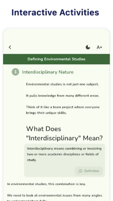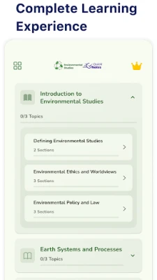 • Organized Learning Path: Learn essential topics such as biodiversity, pollution control, and resource management in a structured flow.